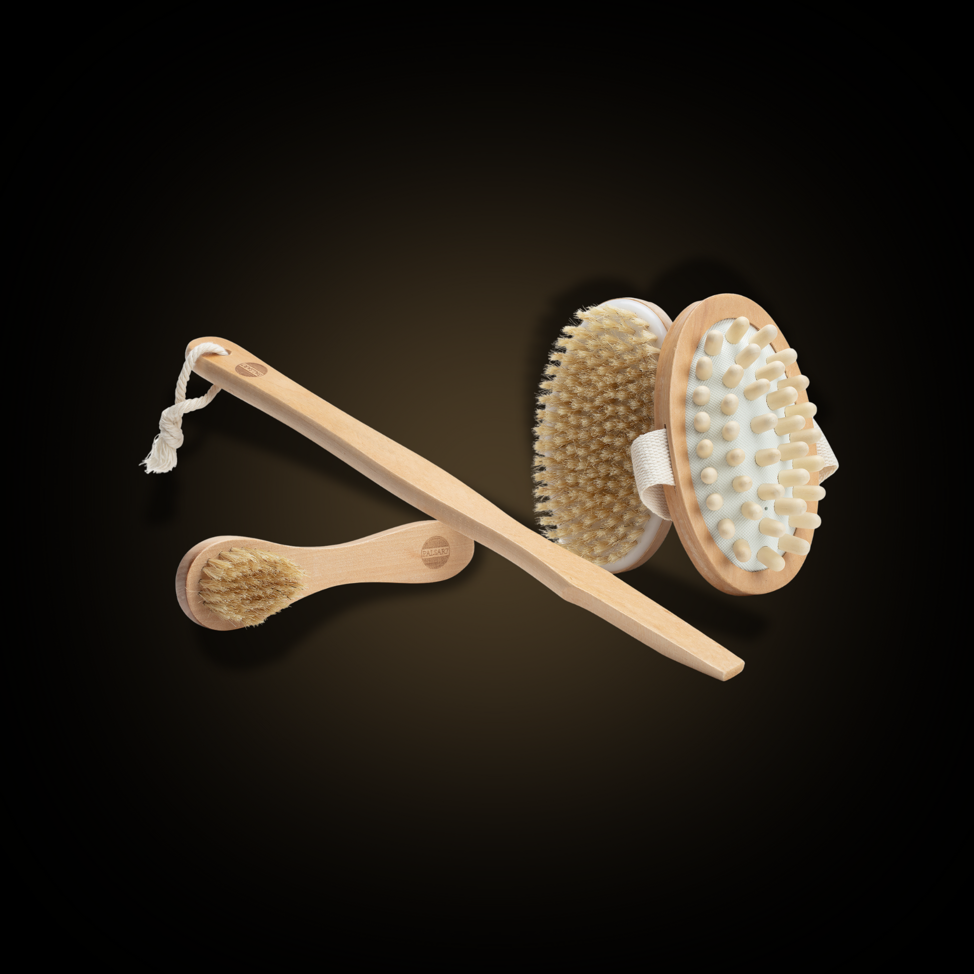The long handle allows you to reach difficult spots such as the middle of the back, while the interchangeable heads adapt to your needs — a brush head for washing and cleansing, and a massage head for stimulating and relaxing the skin. Each head can also be used without the handle, thanks to a woven strap that fits comfortably in your hand. The small brush completes the set, making it a comprehensive accessory for your bath, sauna, or wellness routine.